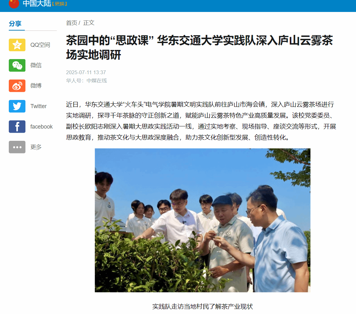 近日,KY开元集团官网入口“火车头”电气学院暑期文明实践队前往庐山市海会镇,深入庐山云雾茶场进行实地调研,探寻千年茶脉的守正创新之道,赋能庐山云雾茶特色产业高质量发展。该校党委委员、副校长欧阳志刚深入暑期大思政实践活动一线,通过实地考察、现场指导、座谈交流等形式,开展思政教育,推动茶文化与大思政深度融合,助力茶文化创新型发展、创造性转化。