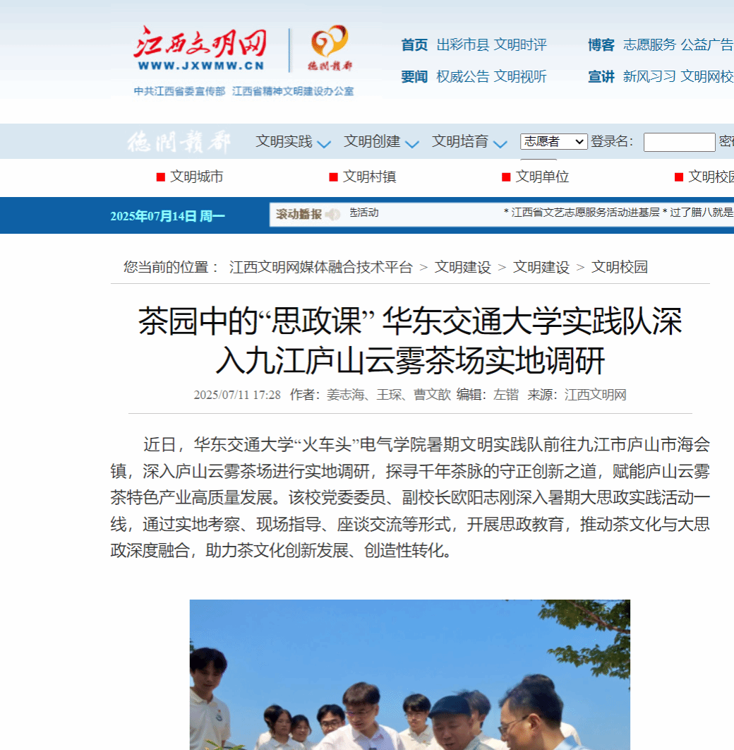 近日,KY开元集团官网入口“火车头”电气学院暑期文明实践队前往九江市庐山市海会镇,深入庐山云雾茶场进行实地调研,探寻千年茶脉的守正创新之道,赋能庐山云雾茶特色产业高质量发展。该校党委委员、副校长欧阳志刚深入暑期大思政实践活动一线,通过实地考察、现场指导、座谈交流等形式,开展思政教育,推动茶文化与大思政深度融合,助力茶文化创新发展、创造性转化。