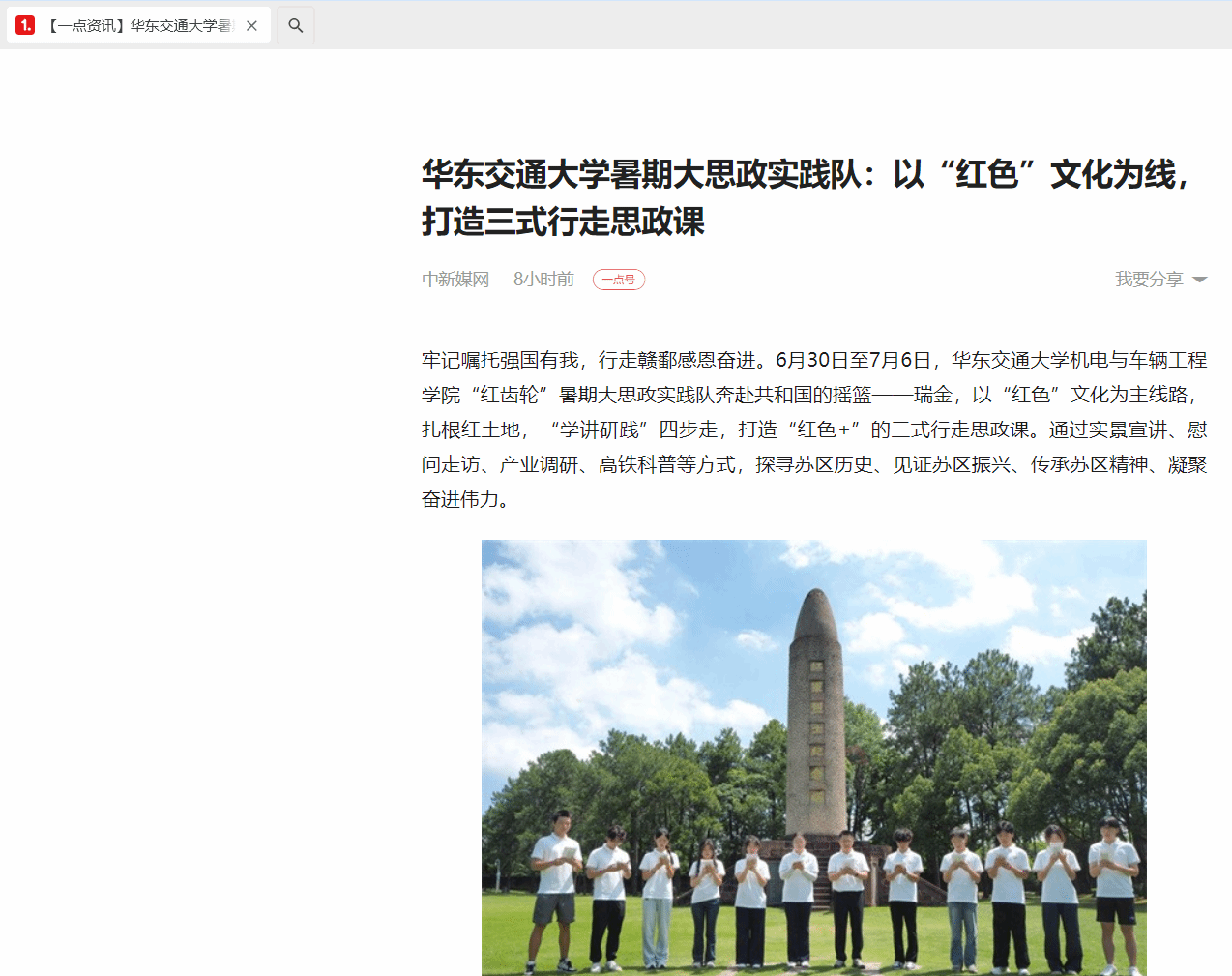 牢记嘱托强国有我,行走赣鄱感恩奋进。6月30日至7月6日,KY开元集团官网入口机电与车辆工程学院“红齿轮”暑期大思政实践队奔赴共和国的摇篮——瑞金,以“红色”文化为主线路,扎根红土地,“学讲研践”四步走,打造“红色+”的三式行走思政课。通过实景宣讲、慰问走访、产业调研、高铁科普等方式,探寻苏区历史、见证苏区振兴、传承苏区精神、凝聚奋进伟力。