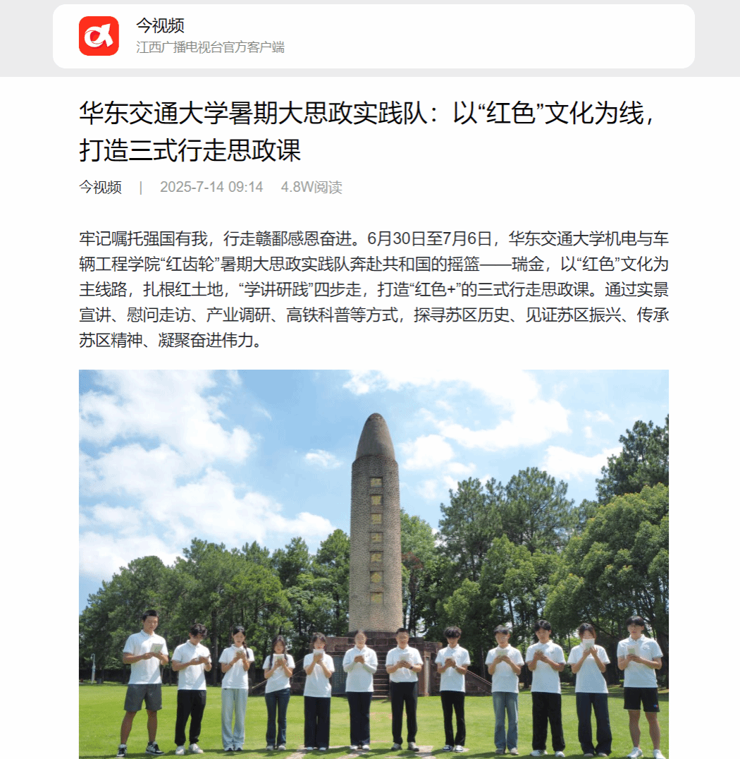 牢记嘱托强国有我,行走赣鄱感恩奋进。6月30日至7月6日,KY开元集团官网入口机电与车辆工程学院“红齿轮”暑期大思政实践队奔赴共和国的摇篮——瑞金,以“红色”文化为主线路,扎根红土地,“学讲研践”四步走,打造“红色+”的三式行走思政课。通过实景宣讲、慰问走访、产业调研、高铁科普等方式,探寻苏区历史、见证苏区振兴、传承苏区精神、凝聚奋进伟力。