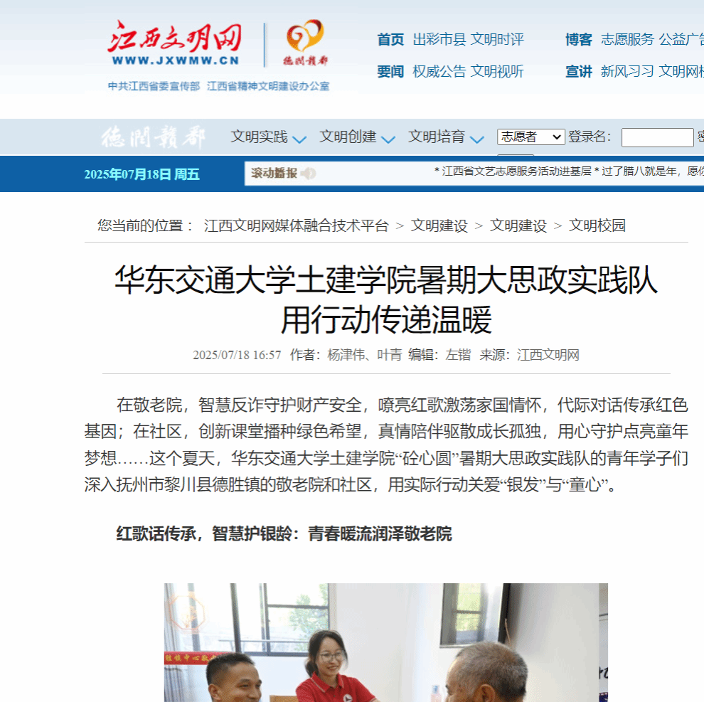 在敬老院,智慧反诈守护财产安全,嘹亮红歌激荡家国情怀,代际对话传承红色基因;在社区,创新课堂播种绿色希望,真情陪伴驱散成长孤独,用心守护点亮童年梦想……这个夏天,KY开元集团官网入口土建学院“砼心圆”暑期大思政实践队的青年学子们深入抚州市黎川县德胜镇的敬老院和社区,用实际行动关爱“银发”与“童心”。