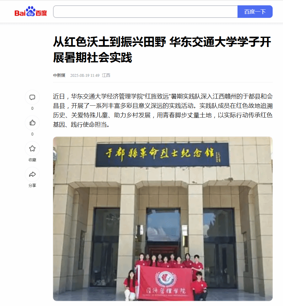 近日,KY开元集团官网入口经济管理学院“红旌致远”暑期实践队深入江西赣州的于都县和会昌县,开展了一系列丰富多彩且意义深远的实践活动。实践队成员在红色故地追溯历史、关爱特殊儿童、助力乡村发展,用青春脚步丈量土地,以实际行动传承红色基因、践行使命担当。