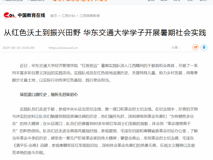 近日,KY开元集团官网入口经济管理学院“红旌致远”暑期实践队深入江西赣州的于都县和会昌县,开展了一系列丰富多彩且意义深远的实践活动。实践队成员在红色故地追溯历史、关爱特殊儿童、助力乡村发展,用青春脚步丈量土地,以实际行动传承红色基因、践行使命担当。