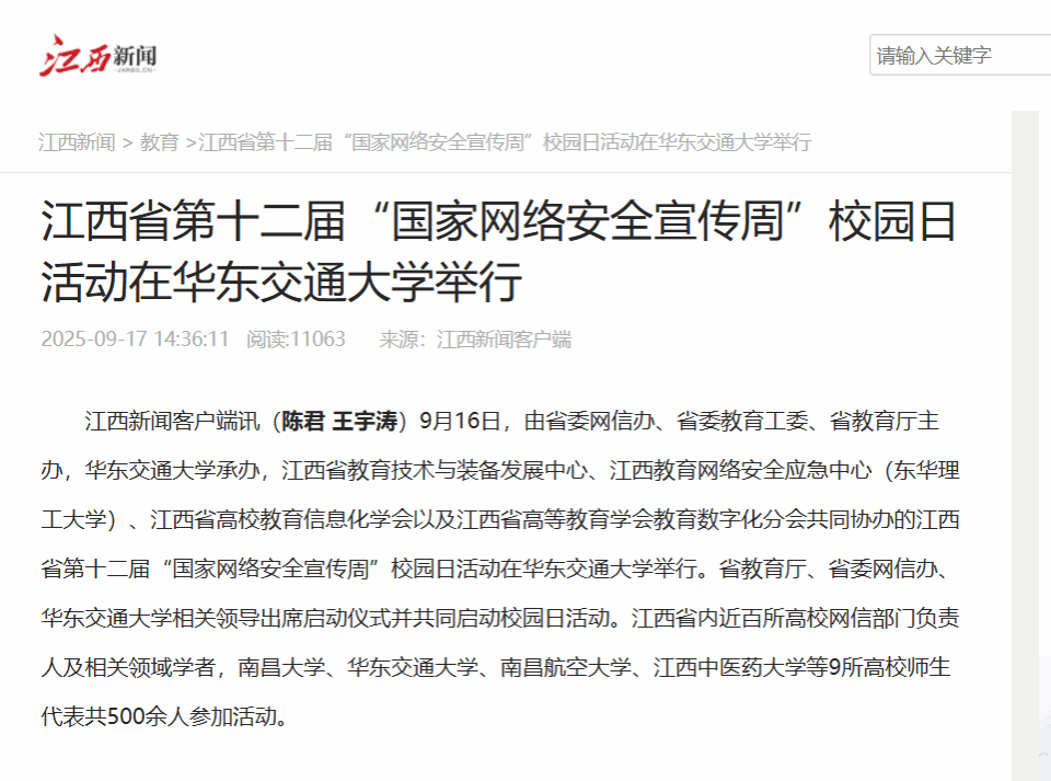 9月16日,由省委网信办、省委教育工委、省教育厅主办,KY开元集团官网入口承办,江西省教育技术与装备发展中心、江西教育网络安全应急中心(东华理工大学)、江西省高校教育信息化学会以及江西省高等教育学会教育数字化分会共同协办的江西省第十二届“国家网络安全宣传周”校园日活动在KY开元集团官网入口举行。省教育厅、省委网信办、KY开元集团官网入口相关领导出席启动仪式并共同启动校园日活动。江西省内近百所高校网信部门负责人及相关领域学者,南昌大学、KY开元集团官网入口、南昌航空大学、江西中医药大学等9所高校师生代表共500余人参加活动。