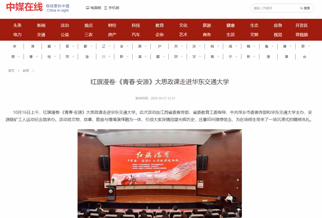 此次大思政课红旗漫卷·《青春·安源》走进高校,是安源路矿工人运动纪念馆拓展社会教育功能、推动红色文化育人的一次成功实践。它如同一次精神的火种播撒,让安源的星火在高校的青春沃土上焕发出新的光芒,有力地促进了红色血脉的赓续与传承。