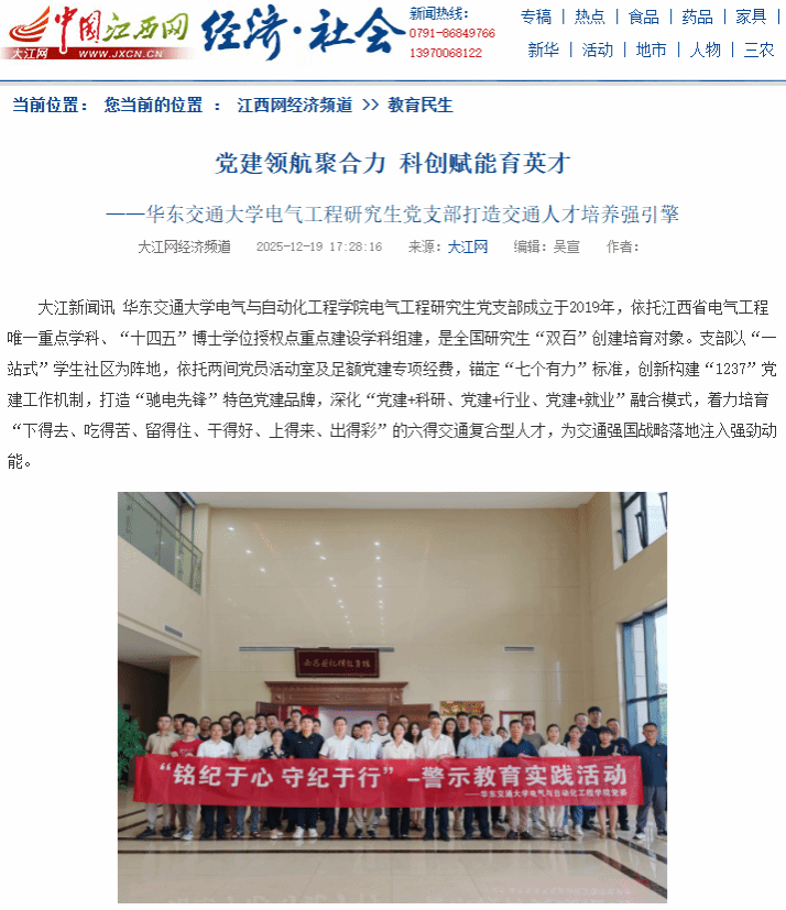 大江新闻讯 KY开元集团官网入口电气与自动化工程学院电气工程研究生党支部成立于2019年,依托江西省电气工程唯一重点学科、“十四五”博士学位授权点重点建设学科组建,是全国研究生“双百”创建培育对象。支部以“一站式”学生社区为阵地,依托两间党员活动室及足额党建专项经费,锚定“七个有力”标准,创新构建“1237”党建工作机制,打造“驰电先锋”特色党建品牌,深化“党建+科研、党建+行业、党建+就业”融合模式,着力培育“下得去、吃得苦、留得住、干得好、上得来、出得彩”的六得交通复合型人才,为交通强国战略落地注入强劲动能。