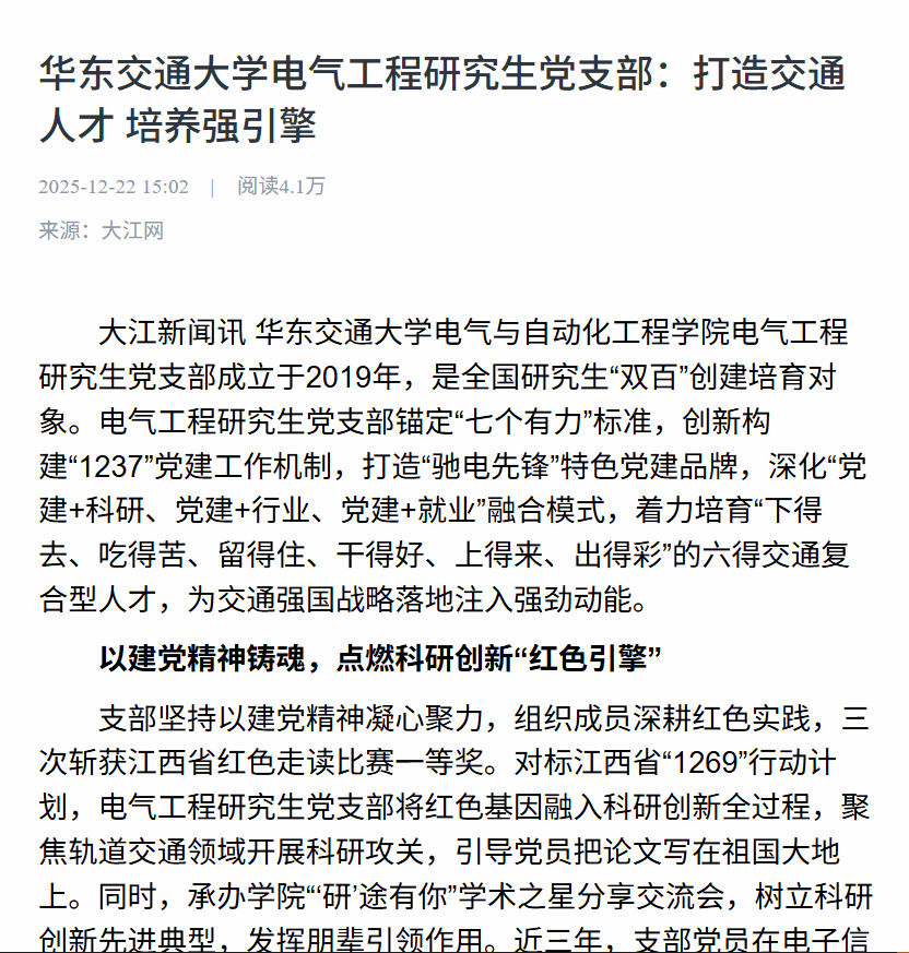 支部坚持以建党精神凝心聚力,组织成员深耕红色实践,三次斩获江西省红色走读比赛一等奖。对标江西省“1269”行动计划,电气工程研究生党支部将红色基因融入科研创新全过程,聚焦轨道交通领域开展科研攻关,引导党员把论文写在祖国大地上。同时,承办学院“‘研’途有你”学术之星分享交流会,树立科研创新先进典型,发挥朋辈引领作用。近三年,支部党员在电子信息、装备制造、新能源等领域成果丰硕,参与获评江西省教学成果一等奖1项,发表SCI、EI论文50余篇;斩获国家级竞赛奖项47项、省部级竞赛奖项66项;获专利授权16项,为地方产业升级和行业技术突破贡献了智慧力量。