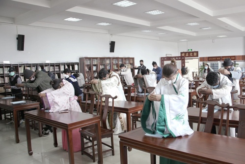 穿汉服是本次课程的文化体验之一,在课程开始之前,留学生们争先恐后,纷纷举手表示想试穿汉服。在老师们的帮助下,一张张洋面孔穿上了各式汉服,“中国古人的衣服太好看了,这是一次非常好的体验!”来自布基纳法索的Farrouk说道。