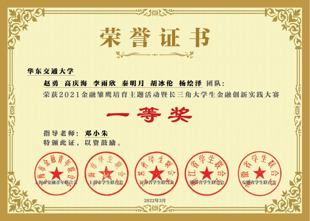 近日,邓小朱教授带领6名金融硕士(赵勇、高庆海、李雨欣、秦明月、胡冰伦、杨绘泽)在全国第一届金融雏鹰创新实践大赛中荣获“一等奖”,邓小朱教授获得“优秀指导老师”称号。