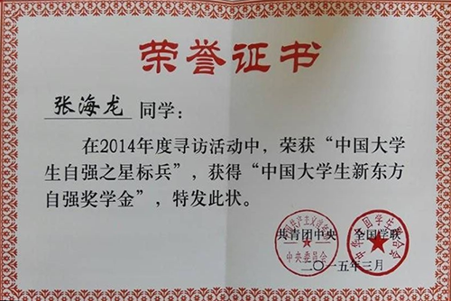 开元荣获2014年度“中国大学生自强之星标兵”和全国“优秀组...
