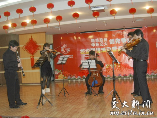 12月21日下午,艺术学院与赣能股份公司校企“创先争优”联谊会在赣能公司举行。艺术学院党委书记周金鑫、党委副书记李建波出席了联欢会,音乐系9位教师、3位学生参加了表演。 管弦乐合奏双方领导与演职人员合影 ...