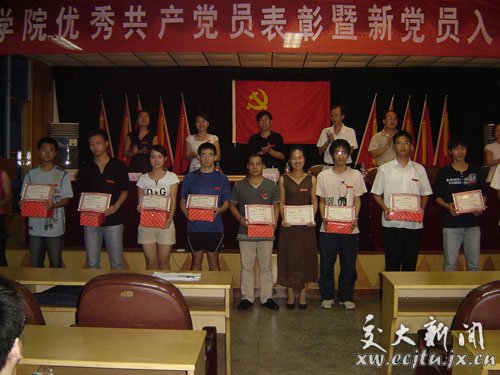 为迎接党的十七大胜利召开,9月27日晚,软件学院优秀共产党员表彰暨新党员入党宣誓大会在北区礼堂三楼举行。院党总支书记邓毅雄、副书记程其胜、党总支委员李伯忠及各党支部书记出席。参加大会的还有新老学生党员、入...