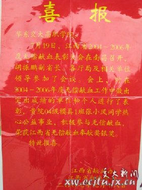 一直以来,高职学院注重公益事业和爱心活动,在2007年上半年的江西省无偿献血中,学院共有150多人献出了自己的爱心。 7月19日,江西省2004—2006年度无偿献血表彰大会在南昌召开,胡振鹏副省长、各厅局及相关单位...