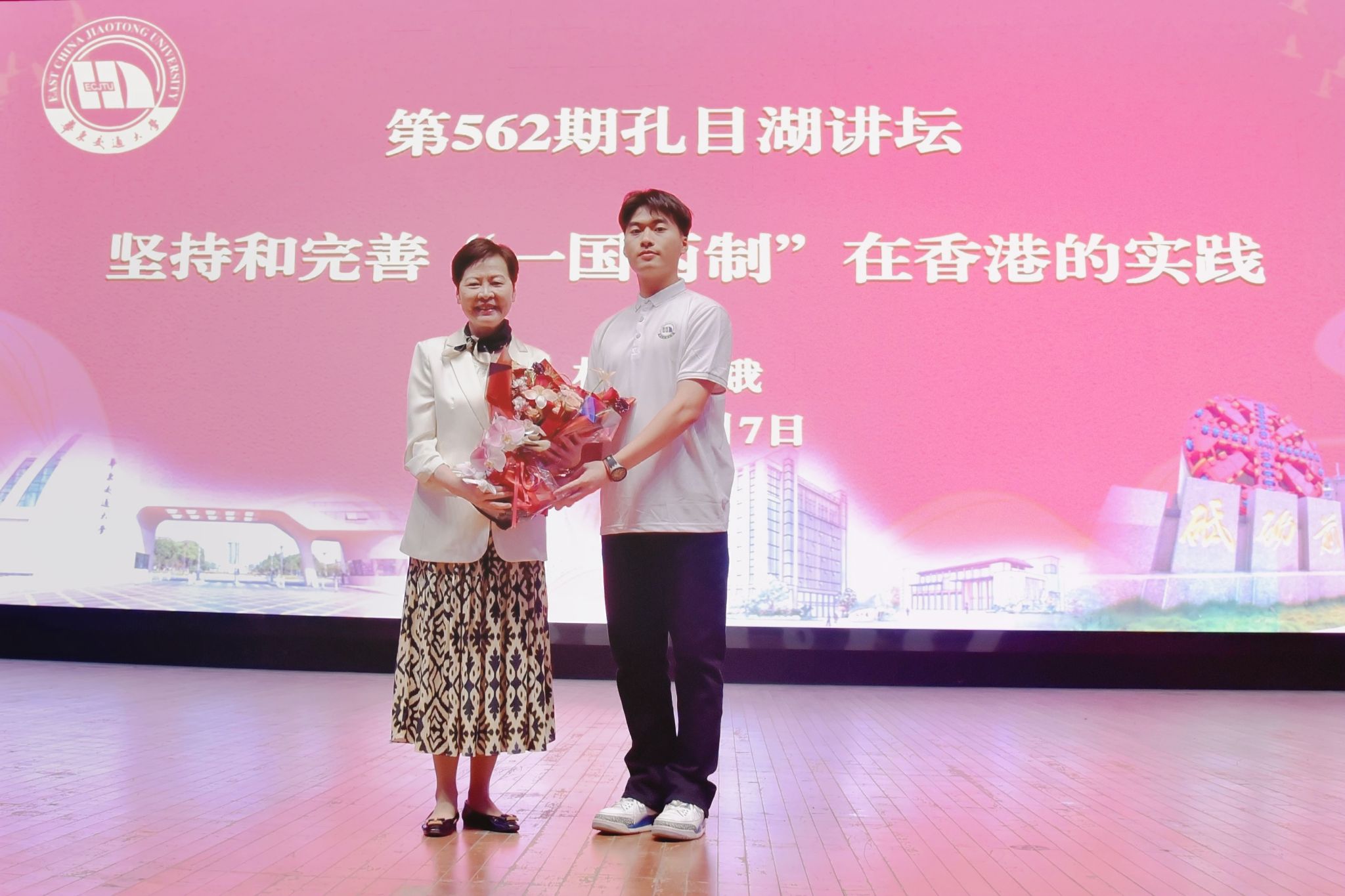 讲座前,林郑月娥女士参观了学校校史馆,深入了解了学校发展历史和现状。徐长节代表学校向林郑月娥女士赠送了纪念品。讲座结束后,学生代表向林郑月娥女士赠送自制的鲜花,以表达敬意和感谢。(交大融媒 供图)
