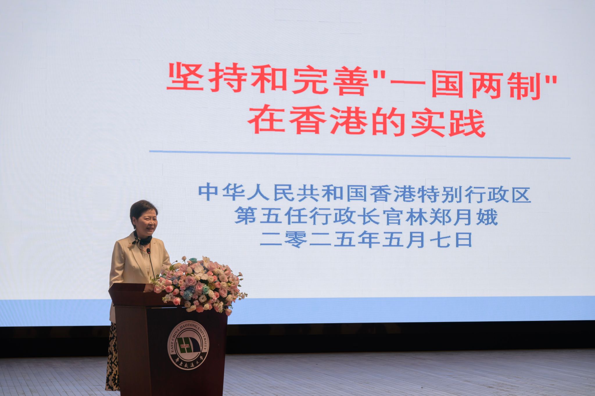 5月7日下午,香港特别行政区第五任行政长官林郑月娥女士到访开元,并做客第562期孔目湖讲坛,作题为《坚持和完善“一国两制”在香港的实践》的专题讲座。江西省委原常委、省政府原副省长、江西省文化和旅游研究推广协会会长朱虹,江西省文化和旅游研究推广协会副会长宋雷鸣,香港联合出版(集团)有限公司董事长傅伟中,校党委书记柳和生,校党委副书记、校长徐长节等出席活动。